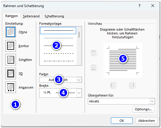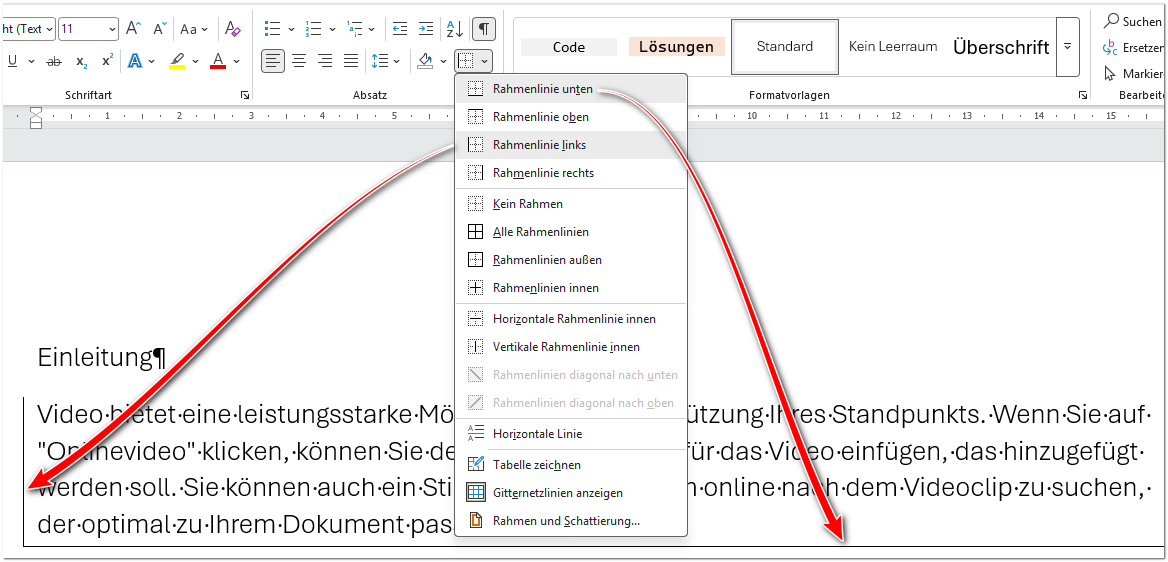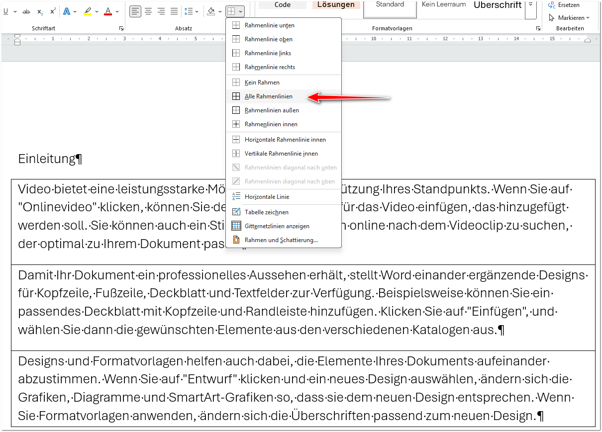 Die Rahmenlinien in der Mitte haben nur dann eine Auswirkung, wenn Sie mehrere Absätze markiert haben: