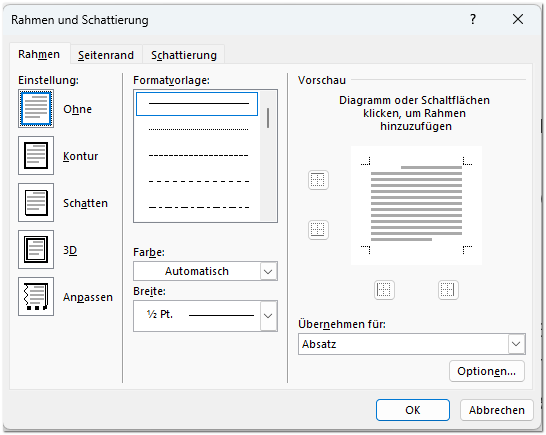 Es erscheint das Dialogfenster für Rahmen und Schattierungen (genau, die Schattierungen, die Sie weiter oben bereits kennengelernt haben!):