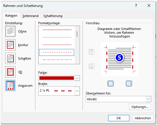 Die Auswahl der Schritte 2 bis 4 waren prima. Aber jetzt müssen Sie Word noch mitteilen, wo Sie diese Rahmen wollen. Das heisst, Sie müssen unbedingt den Schritt 5 noch machen, indem Sie in der Vorschau rechts im Dialogfenster mit der Maus reinklicken und damit sagen, wo Sie die Rahmen möchten. Ich habe beispielsweise links und rechts eine rote gestrichelte dicke Linie gewählt: