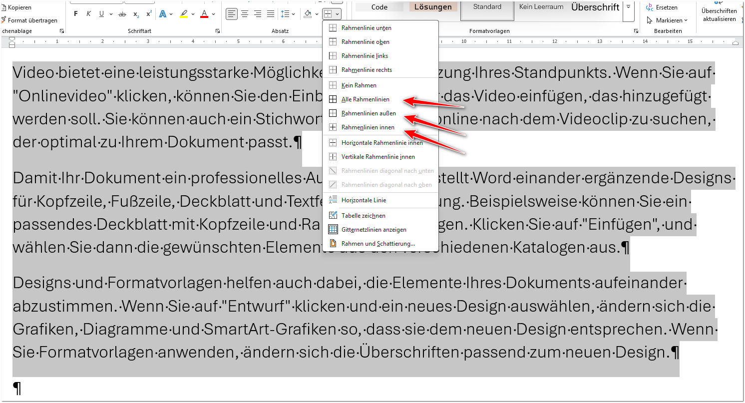 Kleiner Hinwes: „Vertikale Rahmenlinen innen“ sind nur bei Tabellen relevant, nicht bei normalen Absätzen.