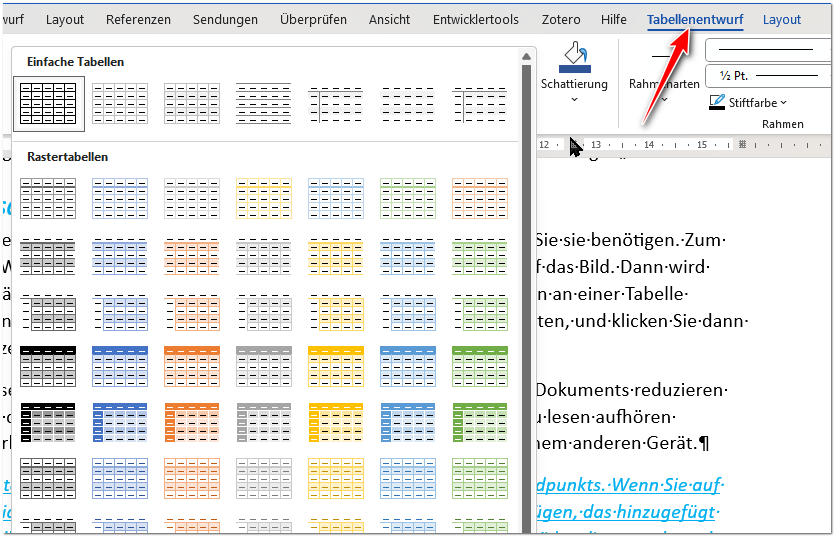 Sobald Sie eine Tabelle eingefügt haben und sich der Cursor auch in der Tabelle befindet, kriegen Sie ein Register „Tabellenentwurf“: