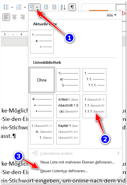 Tipp: sorgen Sie dafür, dass die hier im Screenshot markierte Option Nr. 2 ausreicht für Ihre Überschriften. Wenn Sie eine eigene Listenformatvorlage erstellen müssen, werden Sie vermutlich ein paar Stunden beschäftigt sein…