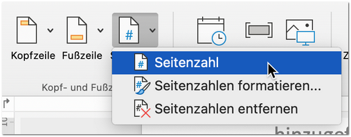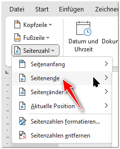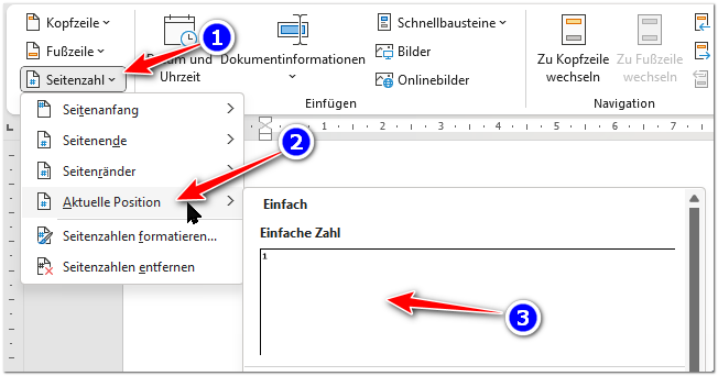 Das fügt an der aktuellen Cursorposition eine einfache Seitenzahl ein. Das bedingt natürlich, dass sich der Cursor bereits in der Fusszeile an der richtigen Stelle befindet.