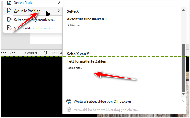 Es gibt Schritte, die Sie machen, bei welchen Word nicht nur eine Seitenzahl einfügt, sondern noch einen zusätzlichen Absatz. Das passiert, wenn Sie die Seitenzahl nicht aus der Gruppe „Aktuelle Position“, sondern beispielsweise aus der Gruppe „Seitenende“ auswählen: