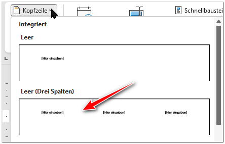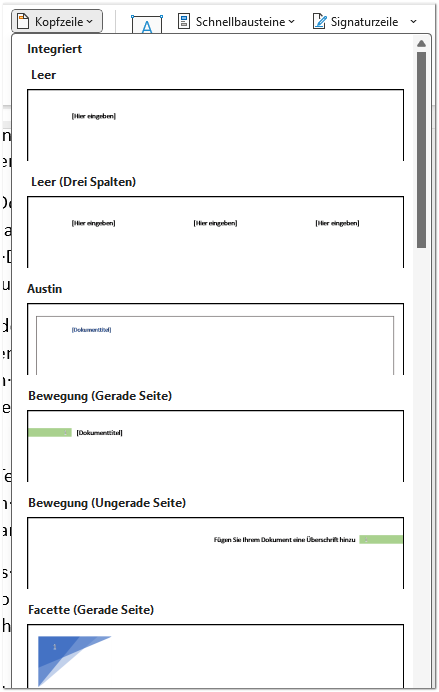 Es ist verlockend, z.B. im Register „Einfügen“ für eine Kopfzeile einen dieser fixfertigen Bausteine zu wählen: