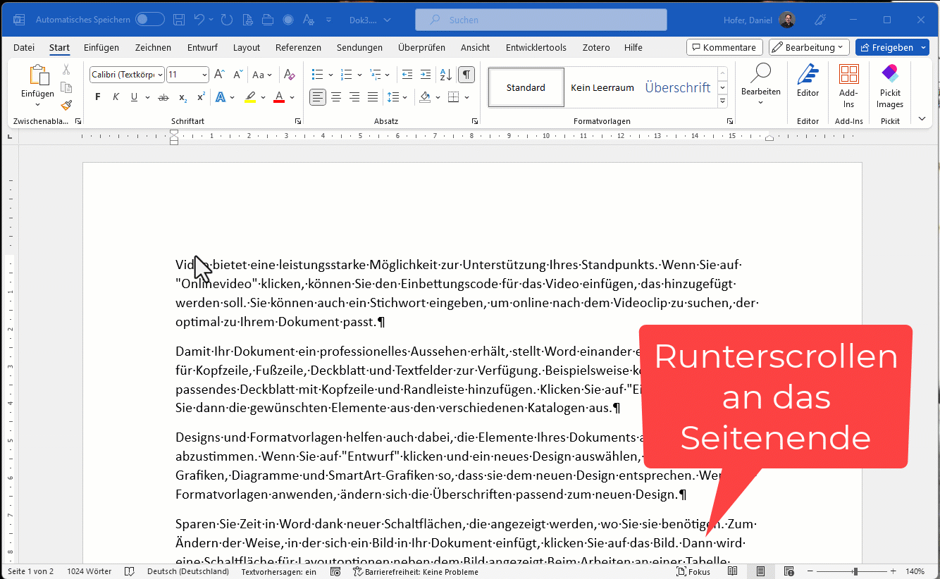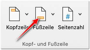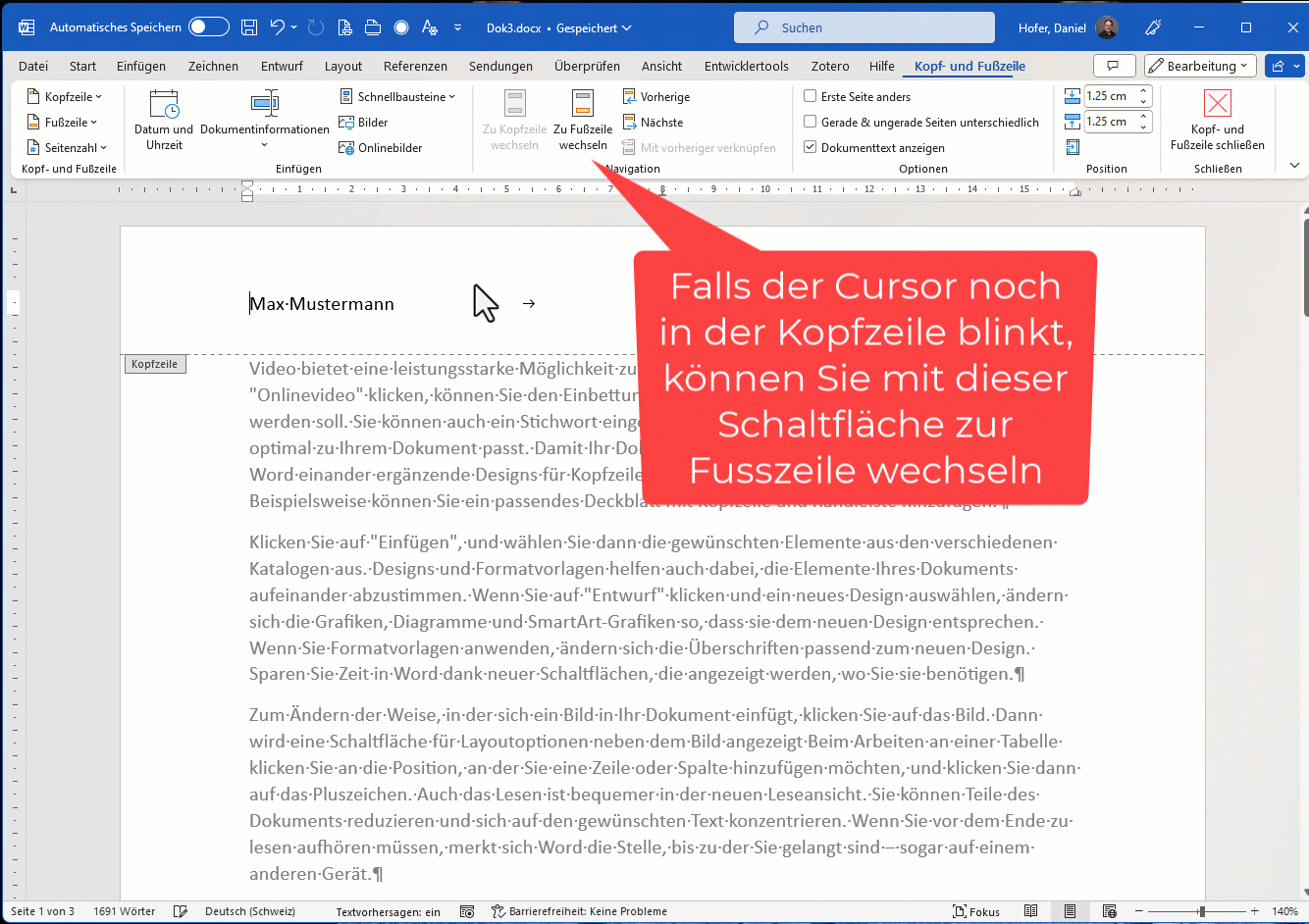 (oder, falls Sie sich noch in der Kopfzeile befinden, Klick auf „Zu Fusszeile wechseln, siehe Video) - Allenfalls mit der Tabulator-Taste in die Mitte springen