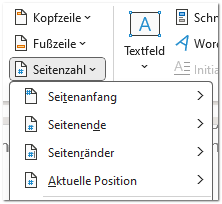 Die einfachste Methode, eine Seitenzahl einzufügen, ist im Register „Einfügen“ versteckt. Sie müssen den Cursor nicht mal vorgängig in der Fusszeile platzieren. Wählen Sie einfach den Punkt hier: