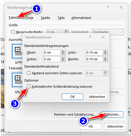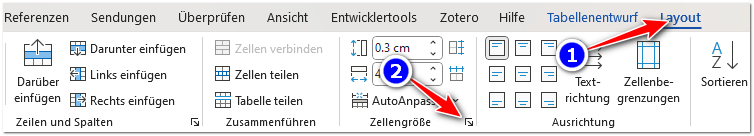 Das Dialogfenster „Tabelleneigenschaften“ ist gelegentlich praktisch. Sie finden es, indem Sie zuerst in die Tabelle klicken und dann im Register „Layout“ (Nr. 1) auf den Dialogverweise (Nr. 2) klicken: