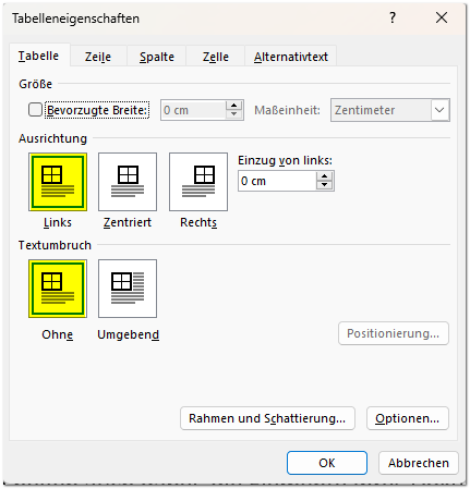 Tipp: ändern Sie die beiden gelb markierten Optionen nicht! Zumindest die zweite bezüglich Textfluss sollten Sie so belassen (wie Sie ja auch bei Bildern am besten ohne Textfluss arbeiten sollten).