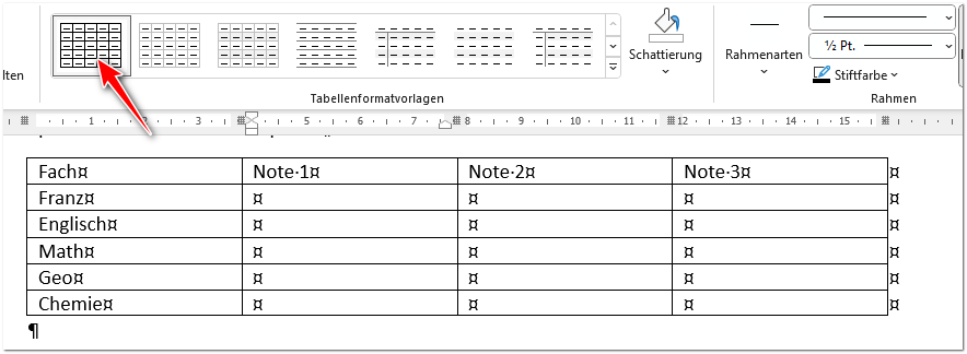 Sobald Sie eine Tabelle erstellt haben, wird dieser das einfache „Tabellenraster“ als Vorlage zugewiesen:
