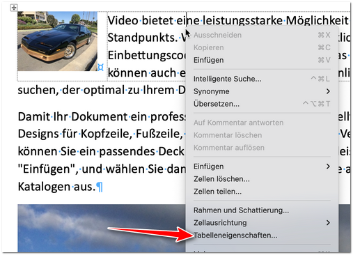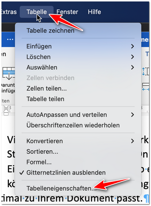 Da es auf einem Mac die Dialogverweise nicht gibt, klicken Sie am einfachsten mit rechter Maustaste in die Tabelle (irgendwo) und wählen im Kontextmenü den Punkt „Tabelleneigenschaften…“: