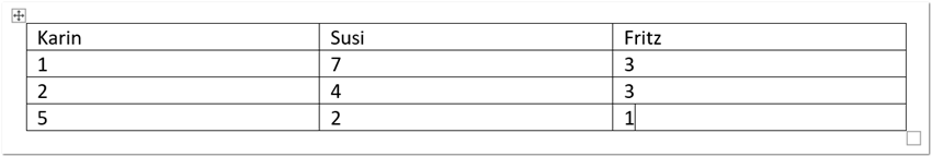 Am effizienztesten erfassen Sie in einer Tabelle Werte, wenn Sie mit der TAB-Taste zur nächsten Zelle springen. Mit Shift + TAB springen Sie wieder eine Zelle zurück.