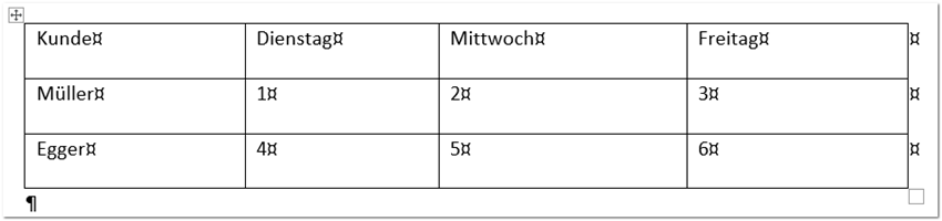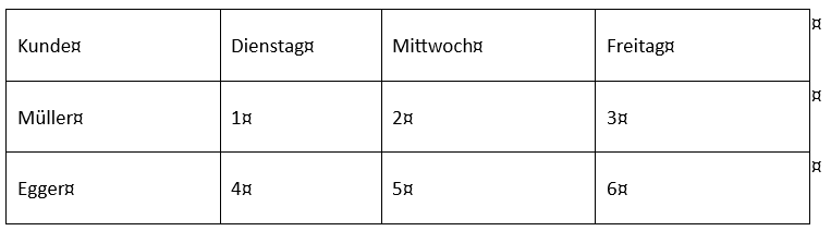 Ändern Sie die Spaltenbreite der zweiten Spalte (Dienstag) auf 3 cm. Die Spaltenbreiten der anderen Spalten sollen sich nicht ändern.