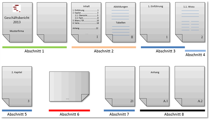 Jedes Word-Dokument, auch ein einseitiger Brief, enthält immer einen Abschnitt. Nun kann ein Dokument allerdings auch mehr als ein Abschnitt aufweisen. Die folgende Grafik zeigt exemplarisch ein Dokument, welches in 8 Abschnitte eingeteilt ist (hier am Beispiel eines Geschäftsberichts, aber eine Maturarbeit ist identisch aufgebaut):