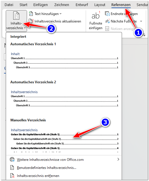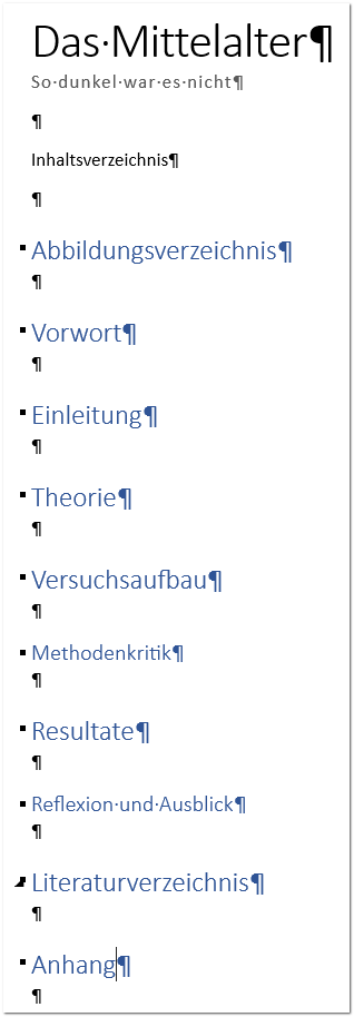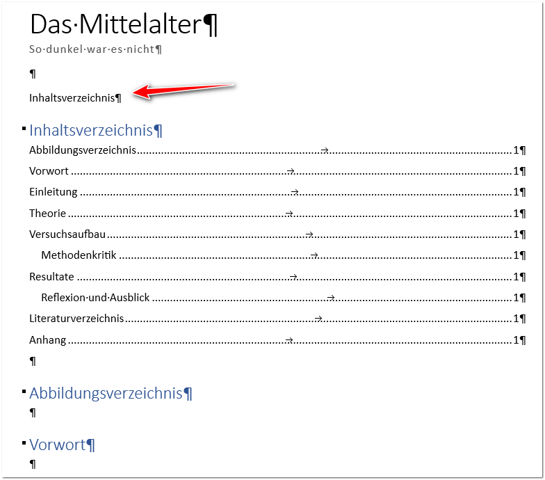 Jetzt ist die Vorarbeit erledigt. Jetzt können Sie an der gewünschten Stelle das automatische Inhaltsverzeichnis einfügen: