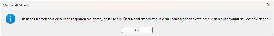 Die beiden automatischen Inhaltsverzeichnisse liefern eine Fehlermeldung, dass Sie zuerst Formatvorlagen zuweisen sollen: